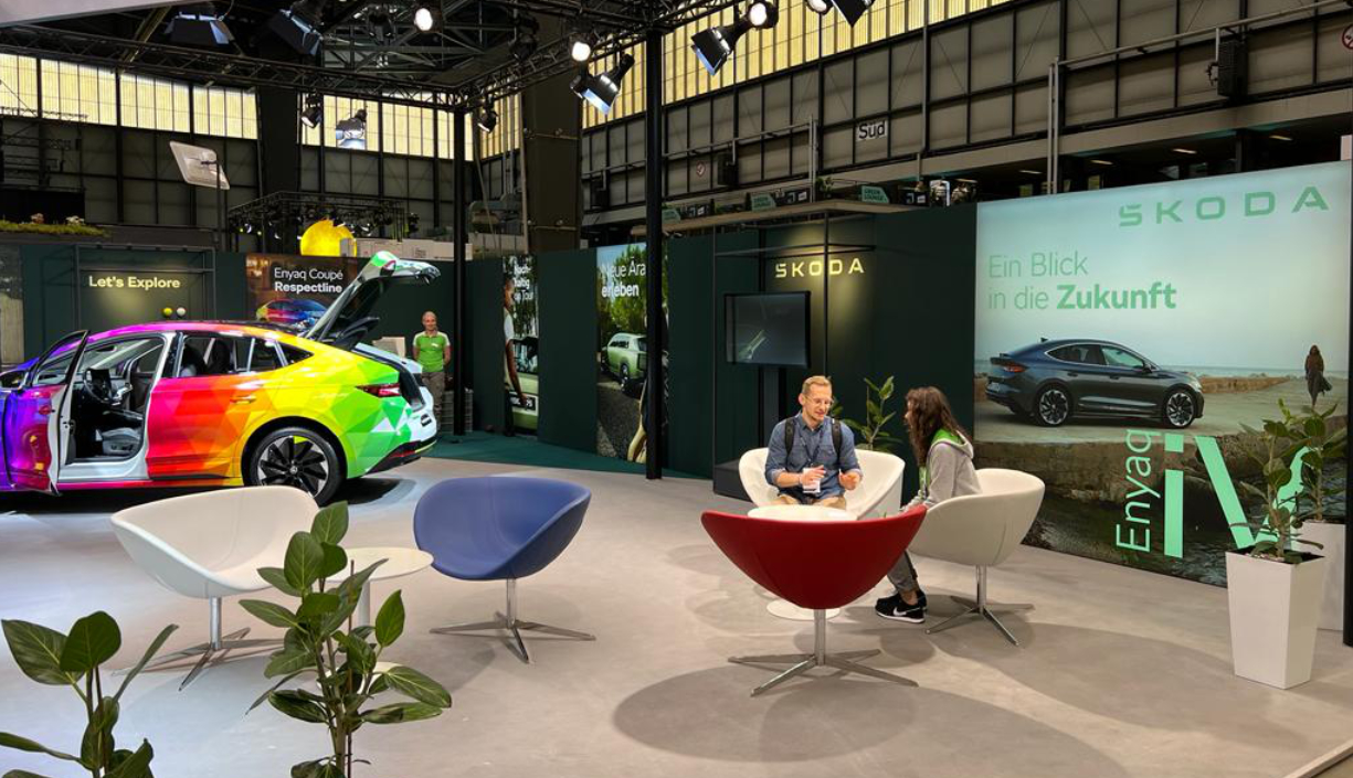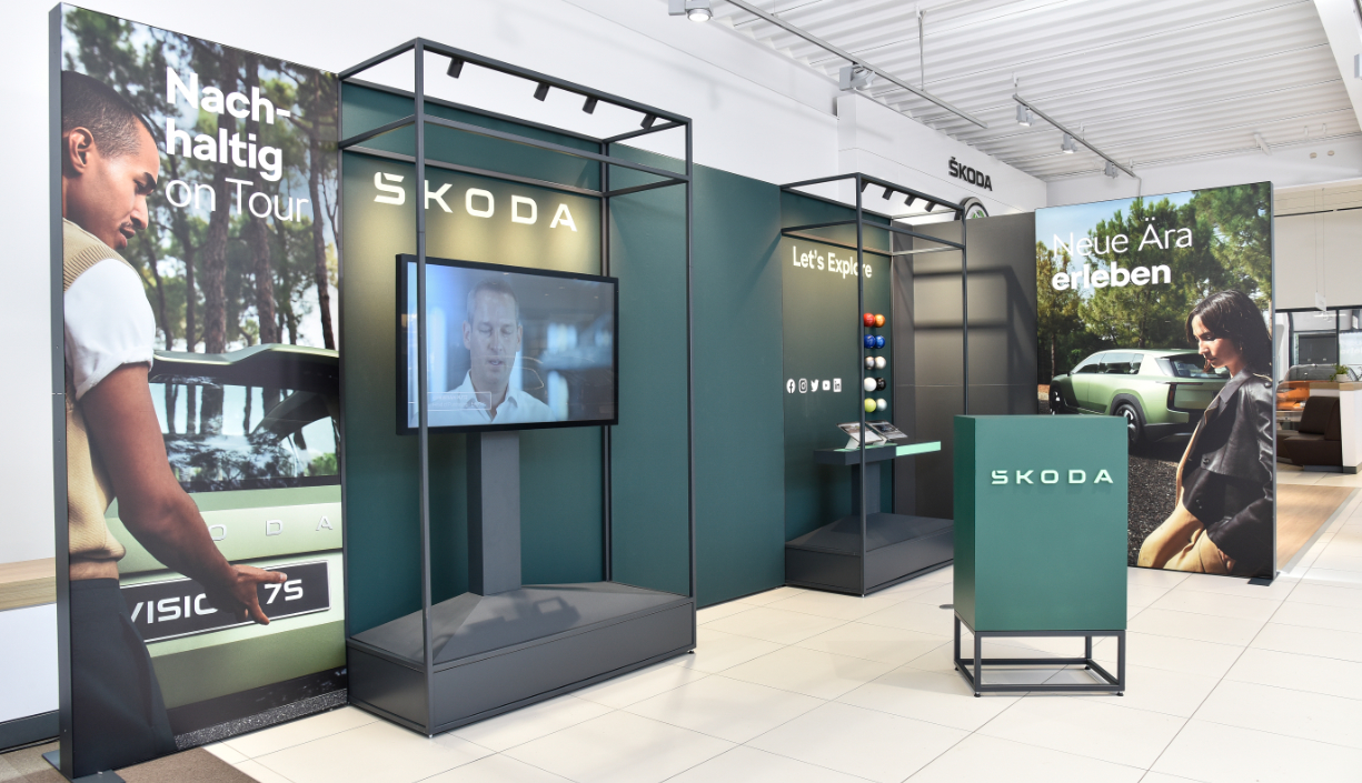 Das Thema Elektromobilität wird auf hochwertigen LED-Grafikwänden eingespielt und zeigt die Kompetenz von Škoda auf diesem Zukunftsfeld.