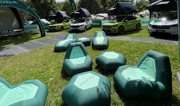 Sitzkomfort wird bei Škoda groß geschrieben. Das gilt nicht nur im Fahrzeuginnenraum, sondern ebenso in der gemütlichen Škoda Lounge. Große grüne Sitz- und Liegekissen laden zum entspannten Chillen ein.